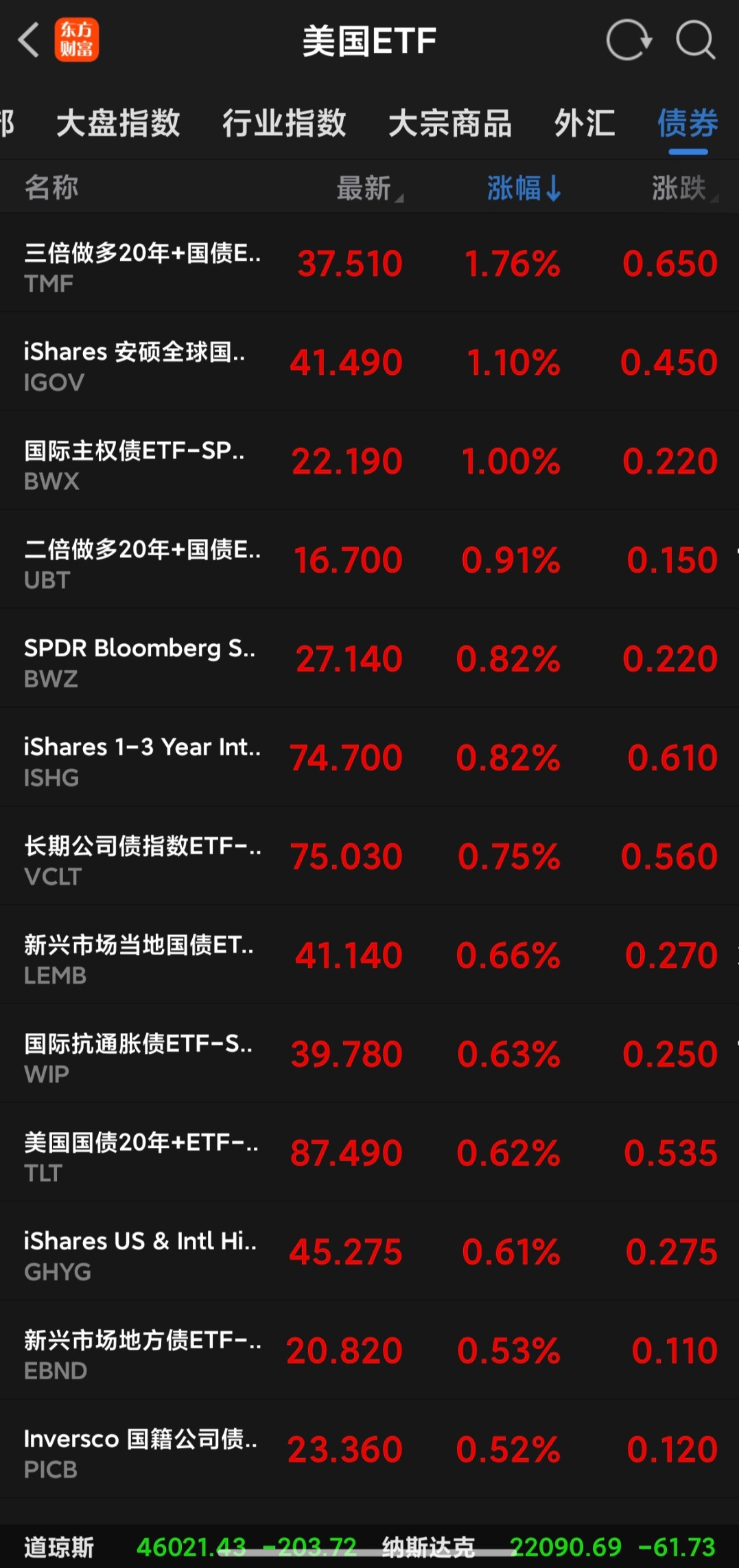 三倍做多20年期以上国债ETF-Direxion(TMF.US) 升超 1.76%,成交额 2.73 亿美元。