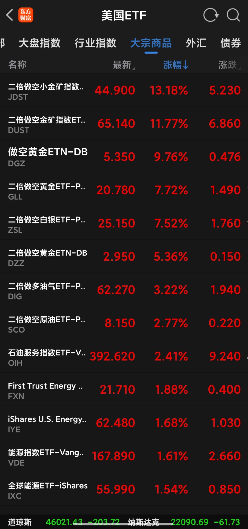 做空黄金ETN(德银)(DGZ.US) 升超 9.76%,成交额 12.21 万美元。