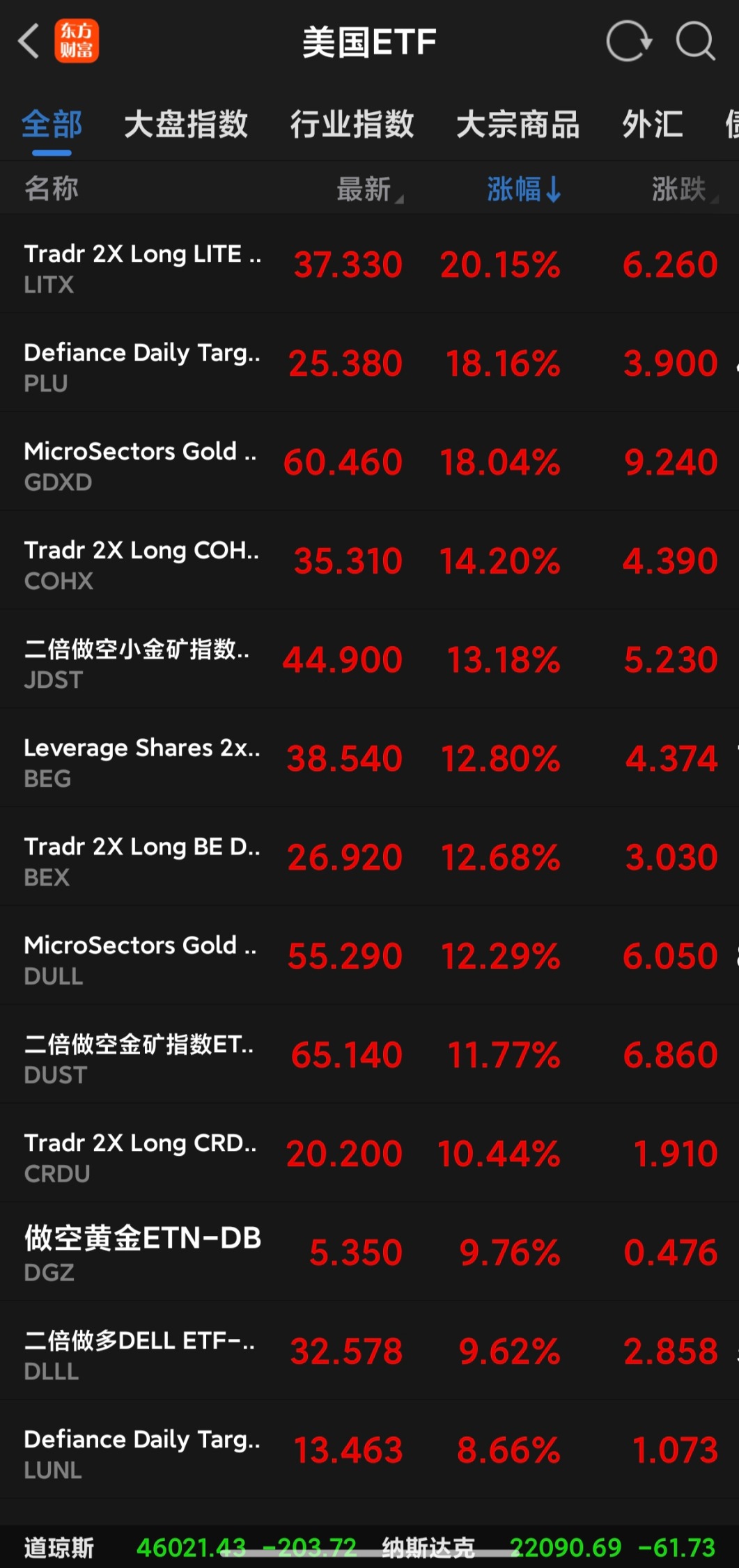 2倍做多LITE ETF-Tradr(LITX.US) 升超 20.15%,成交额 1.63 亿美元。