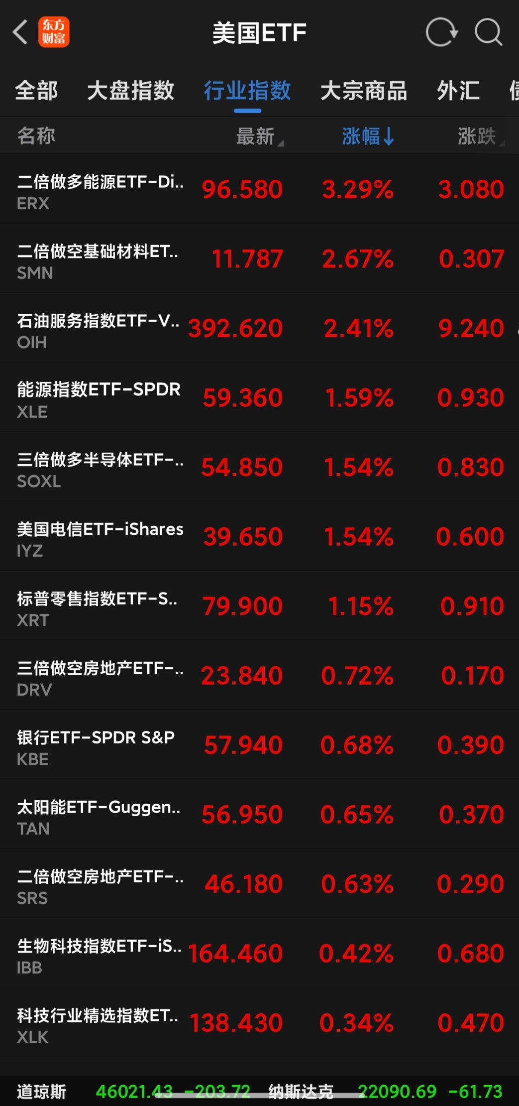 2倍做多能源ETF-Direxion(ERX.US) 升超 3.29%,成交额 6073.16 万美元。