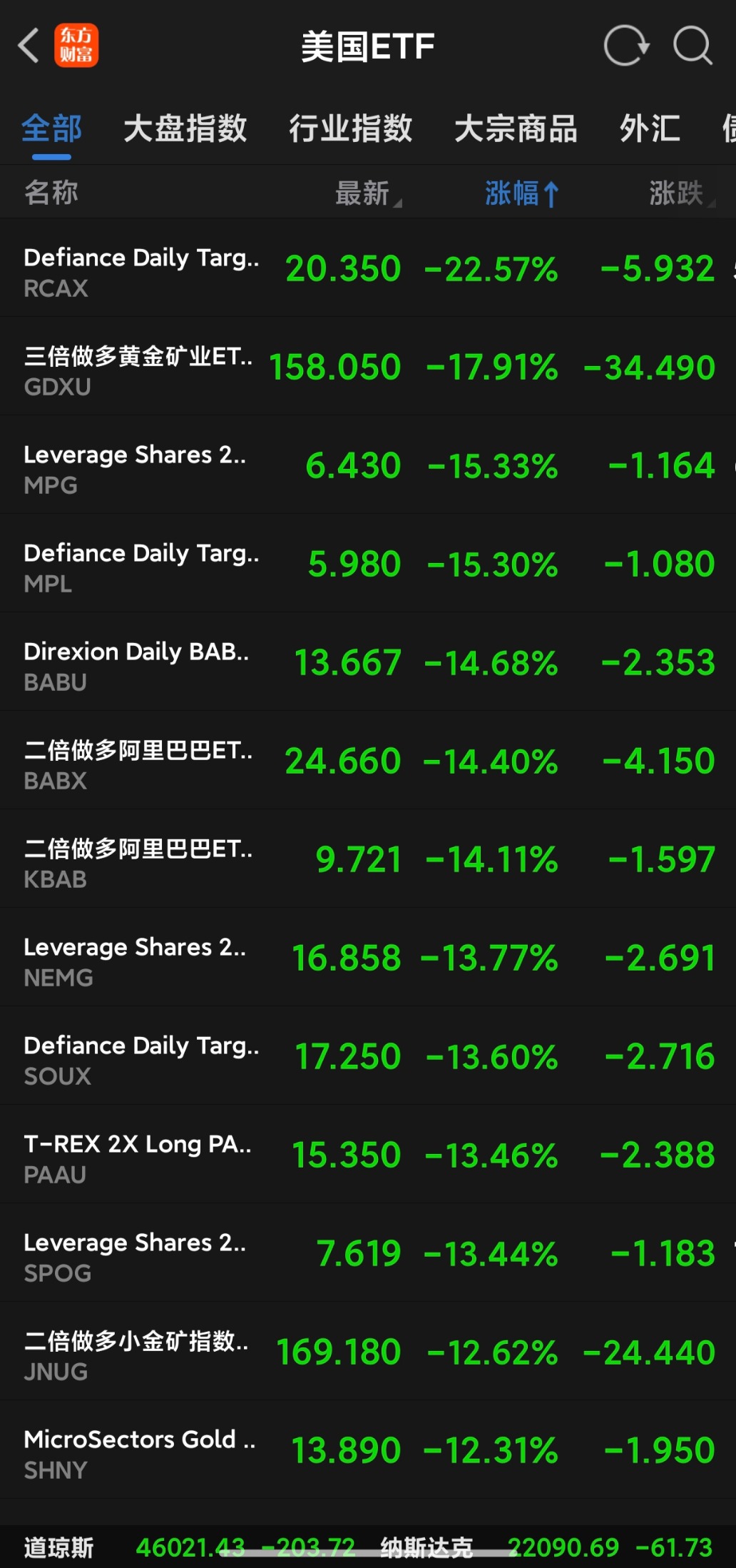 2倍做空金矿指数ETF-Direxion(DUST.US) 升超 11.77%,成交额 1.09 亿美元。