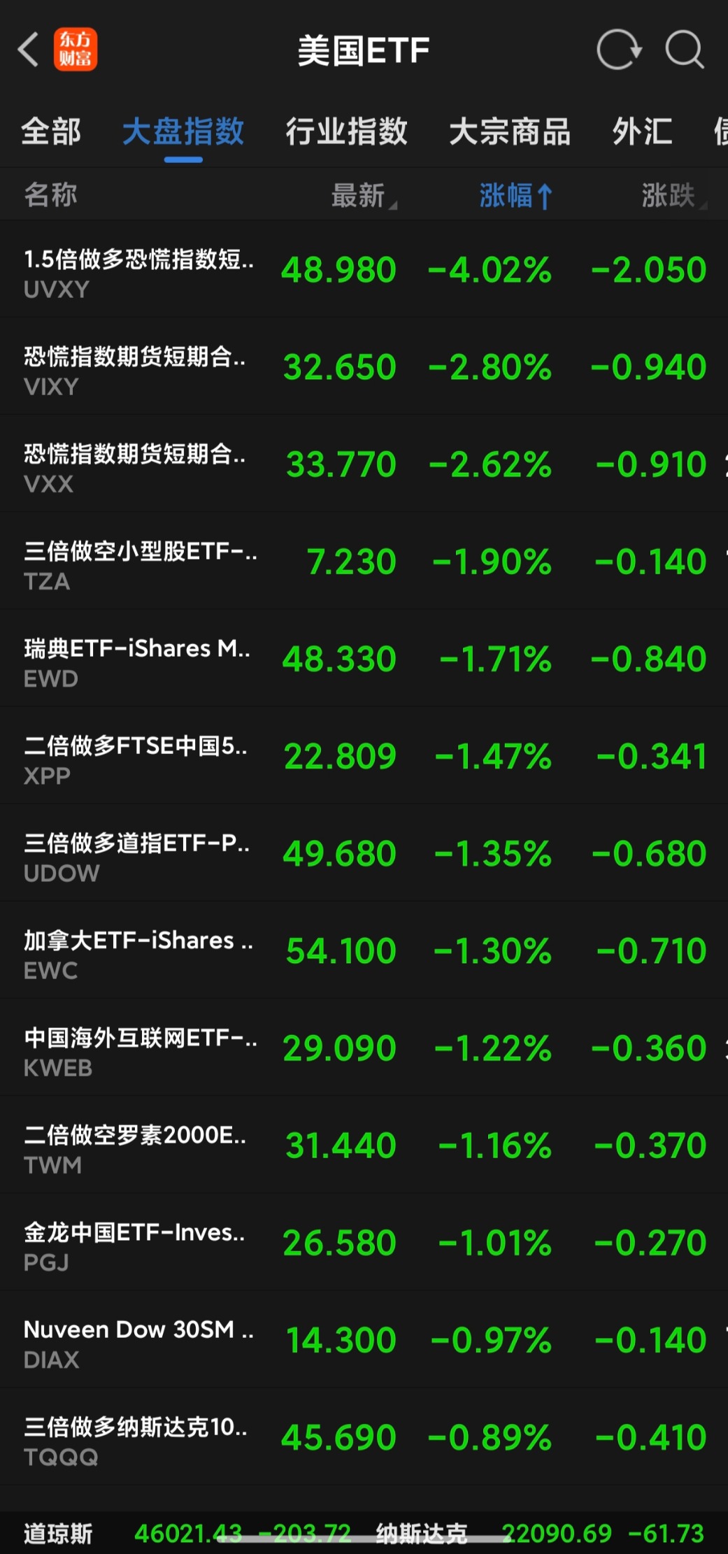 1.5倍做多短期期货恐慌指数ETF-Proshares(UVXY.US) 跌超 4.02%,成交额 4.56 亿美元。