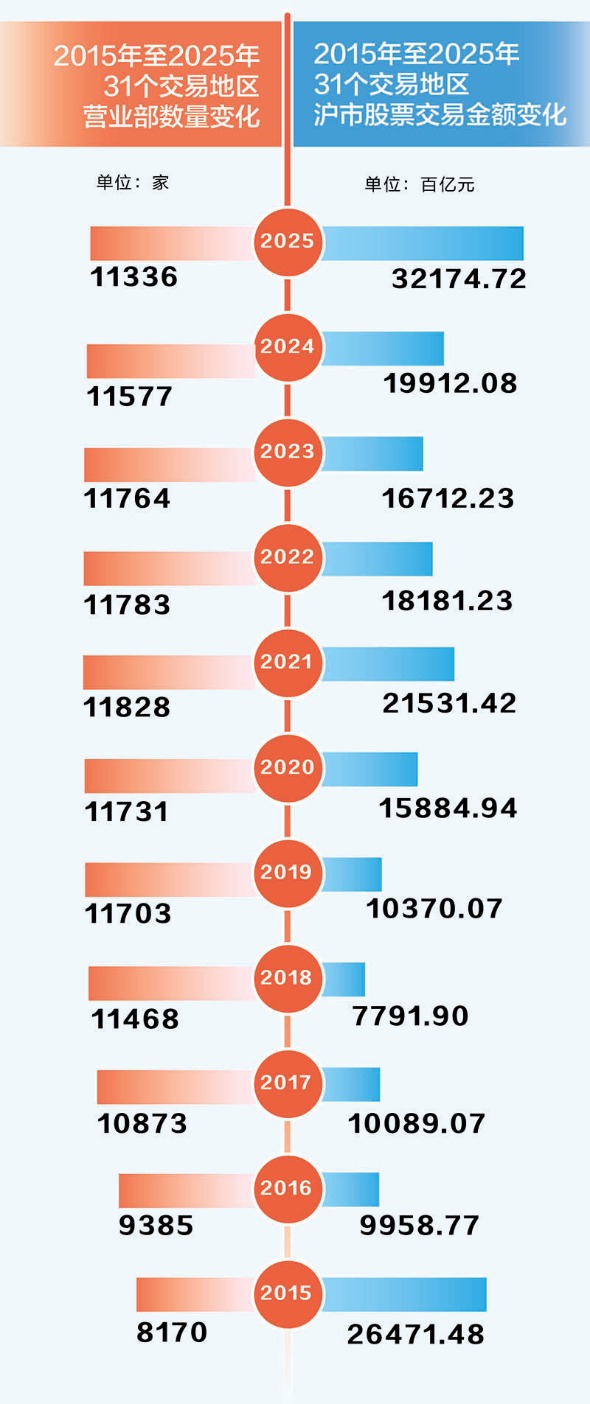 根据证券时报记者对上交所数据的统计,截至2025年末,内地31个交易地区的券商营业部总数为1.13万家,已回落至2018年水平。回顾过去十年,2015年共有8170家营业部,此后券商加大“跑马圈地”力度,2021年达到顶峰——1.18万家,6年时间增长40%。