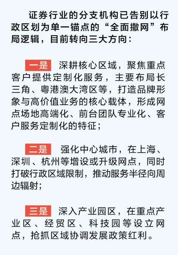 银河证券相关人士表示,证券行业的分支机构已告别以行政区划为单一锚点的“全面撒网”布局逻辑,目前转向三大方向:一是深耕核心区域,聚焦重点客户提供定制化服务,主要布局长三角、粤港澳大湾区等,打造品牌形象与高价值业务的核心载体,形成网点场地高端化、前台团队专业化、客户服务定制化的特征;二是强化中心城市,在上海、深圳、杭州等增设或升级网点,同时打破行政区域限制,推动服务半径向周边辐射;三是深入产业园区,在重点产业区、经贸区、科技园等设立网点,抢抓区域协调发展政策红利。