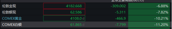此外,国际贵金属价格大幅跳水,截至发稿,COMEX白银跌超11%,COMEX黄金跌超10%,现货白银跌近8%,现货黄金跌逾6%。
