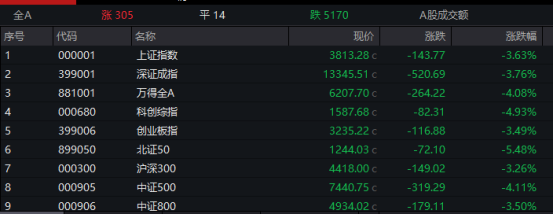 具体来看,两市主要股指盘中单边下行,午后加速跳水。截至收盘,沪指跌3.63%报3813.28点,深证成指跌3.76%,创业板指跌3.49%,科创综指跌4.93%,沪深北三市合计成交约2.45万亿元,较此前一日增加约1450亿元。