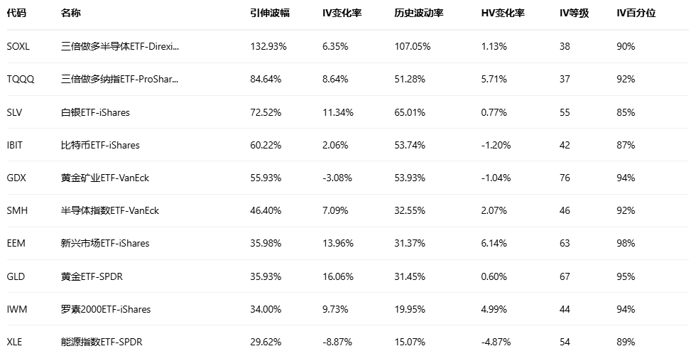 引申波幅排行榜(标的市值>10亿美元,且期权成交量>10万)
