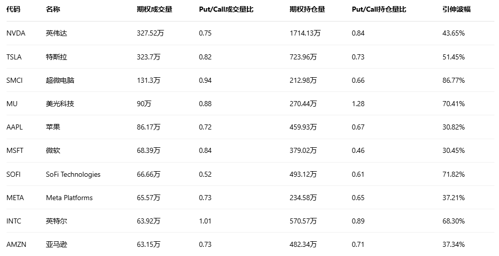 看跌/看涨持仓量比最高是美光科技,达到1.28。美光科技发布强劲财报后股价仍下跌超5%,CEO警告AI内存需求远超供应能力。