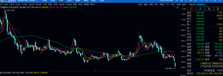 随着黄金下跌,黄金股今日也出现重挫,其中H股老铺黄金首当其冲,盘中跌幅一度超过10%,最终收盘下跌8.59%,报558.5港元/股,相较2025年7月的高点1097.48港元/股,基本腰斩。