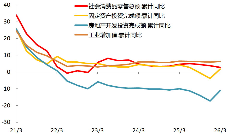 1—2月全国规模以上工业增加值同比增长6.3%,较去年12月加快1.1个百分点,行业回升面持续扩大,新质生产力带动作用凸显。社会消费品零售总额同比增长2.8%,较去年12月加快1.9个百分点,春节假期消费旺季与以旧换新政策双双发力,带动销售数据回暖。固定资产投资同比增长1.8%,扭转去年全年的下滑态势。“十五五”开局重大项目集中开工,政策加力提振有效投资,其中基础设施投资同比增长11.4%,大幅快于整体投资增速,制造业投资同步回暖,民间投资活力边际改善。扣除房地产开发投资后,整体投资增速为5.2%,投资结构持续优化,托底经济作用进一步增强。全国房地产开发投资同比降幅较去年全年收窄,商品房销售面积、销售额同比分别下降13.5%、20.2%,跌幅略收窄,环比出现筑底迹象。房价环比趋稳,部分城市因城施策政策效果逐步显现,市场信心缓慢修复,但行业整体仍处于去库存、调结构周期,投资、销售数据同比尚未转正。