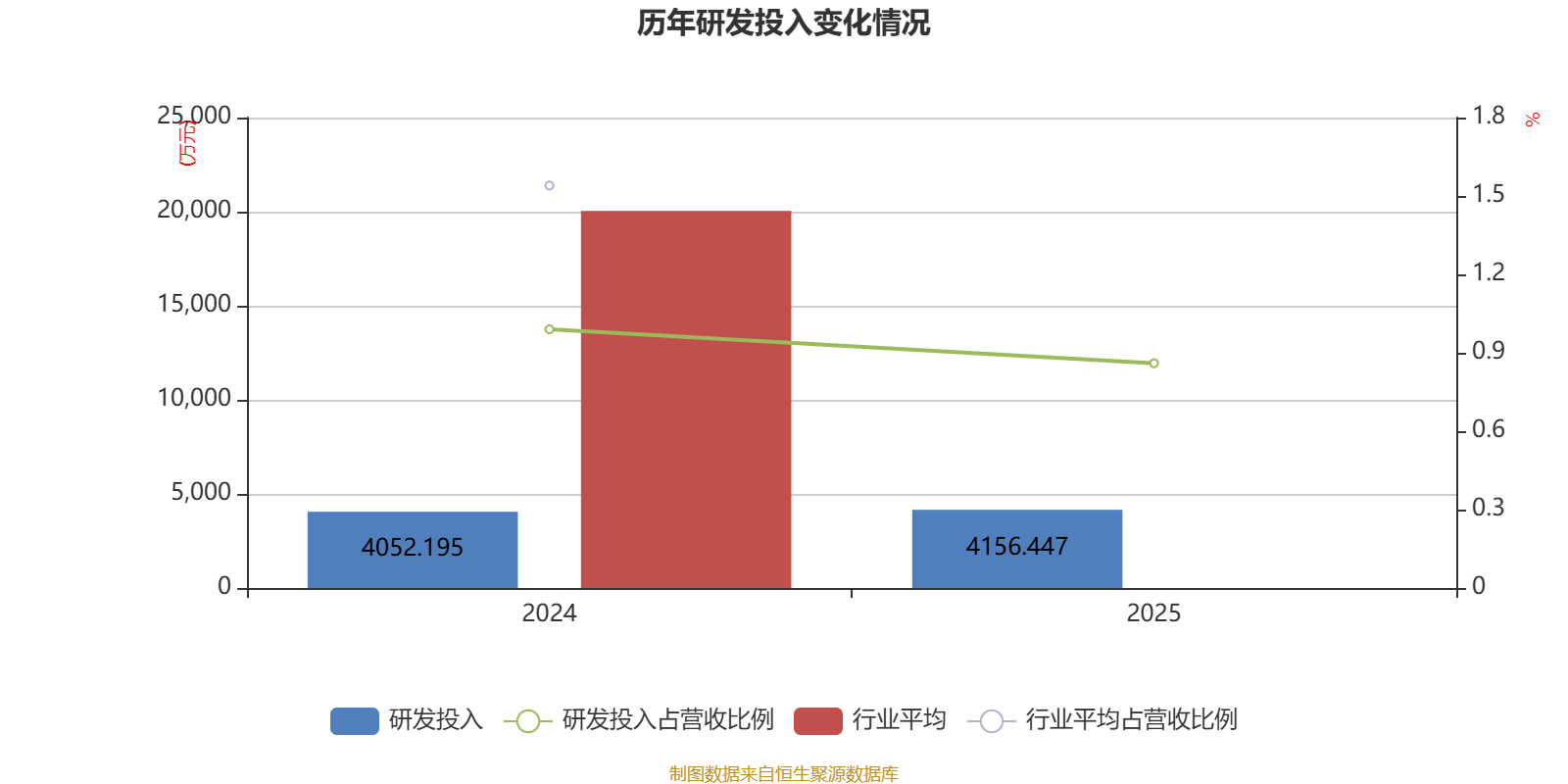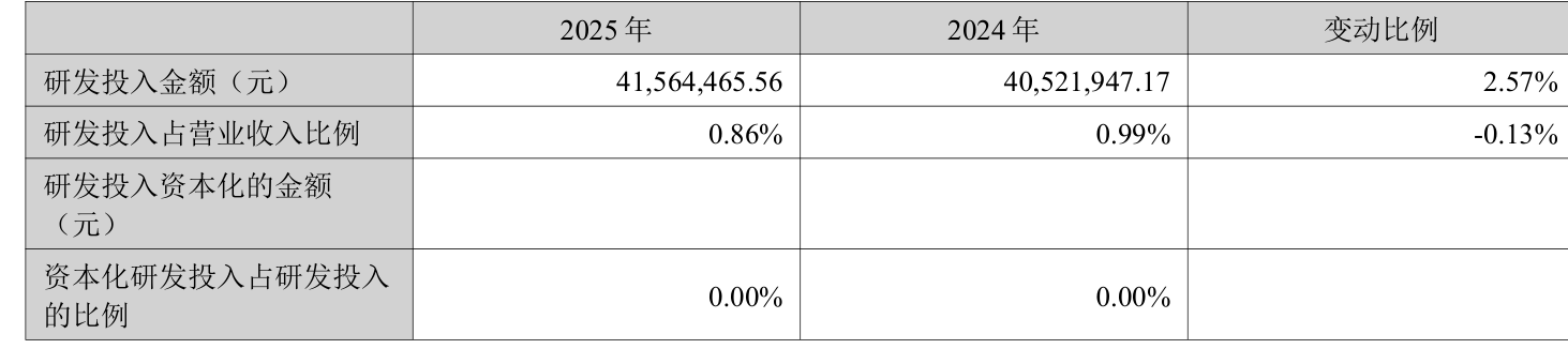 2025年全年,公司研发投入金额为4156.45万元,同比增长2.57%;研发投入占营业收入比例为0.86%,相比上年同期下降0.13个百分点。此外,公司全年研发投入资本化率为0%。