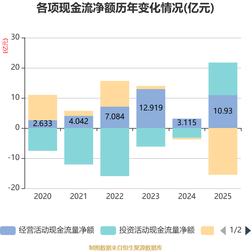 截至2025年,公司经营活动现金流净额为10.93亿元,同比增长250.91%;筹资活动现金流净额-15.55亿元,同比减少14.98亿元;投资活动现金流净额10.8亿元,上年同期为-3.2亿元。
