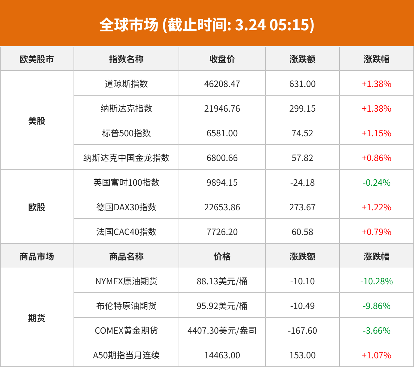 美股市场:美股三大指数03月23日收盘全线上涨。截至收盘,道琼斯工业平均指数比前一交易日上涨631.0点,收于46208.47点,涨幅为1.38%;标准普尔500种股票指数上涨74.52点,收于6581.0点,涨幅为1.15%;纳斯达克综合指数上涨299.15点,收于21946.76点,涨幅为1.38%。据央视新闻,当地时间23日,美国总统特朗普表示,美国正与伊朗进行磋商,以确定能否达成更广泛的协议。伊朗外交部发言人巴加埃当地时间23日表示,在过去24天的冲突中,伊朗未与美国进行任何谈判,伊朗在霍尔木兹海峡问题及结束冲突条件上的立场没有发生改变。
