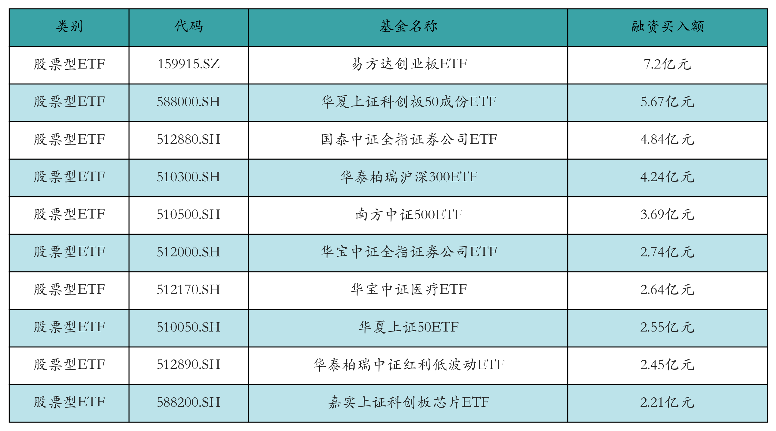 昨日股票型ETF融资买入额最高的3只ETF及其买入金额分别为:易方达创业板ETF(7.2亿元)、华夏上证科创板50成份ETF(5.67亿元)、国泰中证全指证券公司ETF(4.84亿元)。融资买入额前10详情见下表: