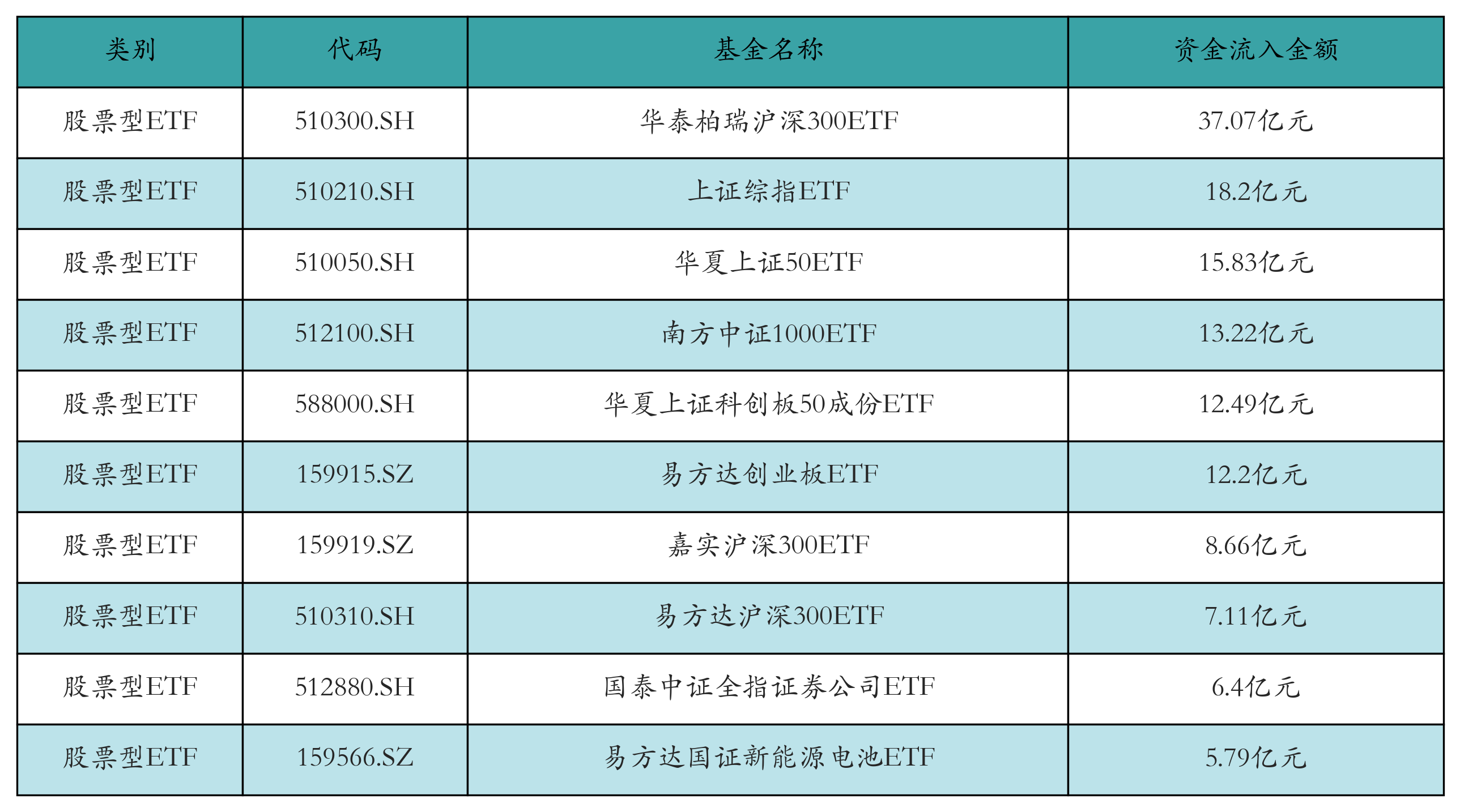 昨日股票型ETF资金流入最多的3只ETF及其流入金额分别为:华泰柏瑞沪深300ETF(流入37.07亿元)、上证综指ETF(流入18.2亿元)、华夏上证50ETF(流入15.83亿元)。资金流入前10详情见下表: