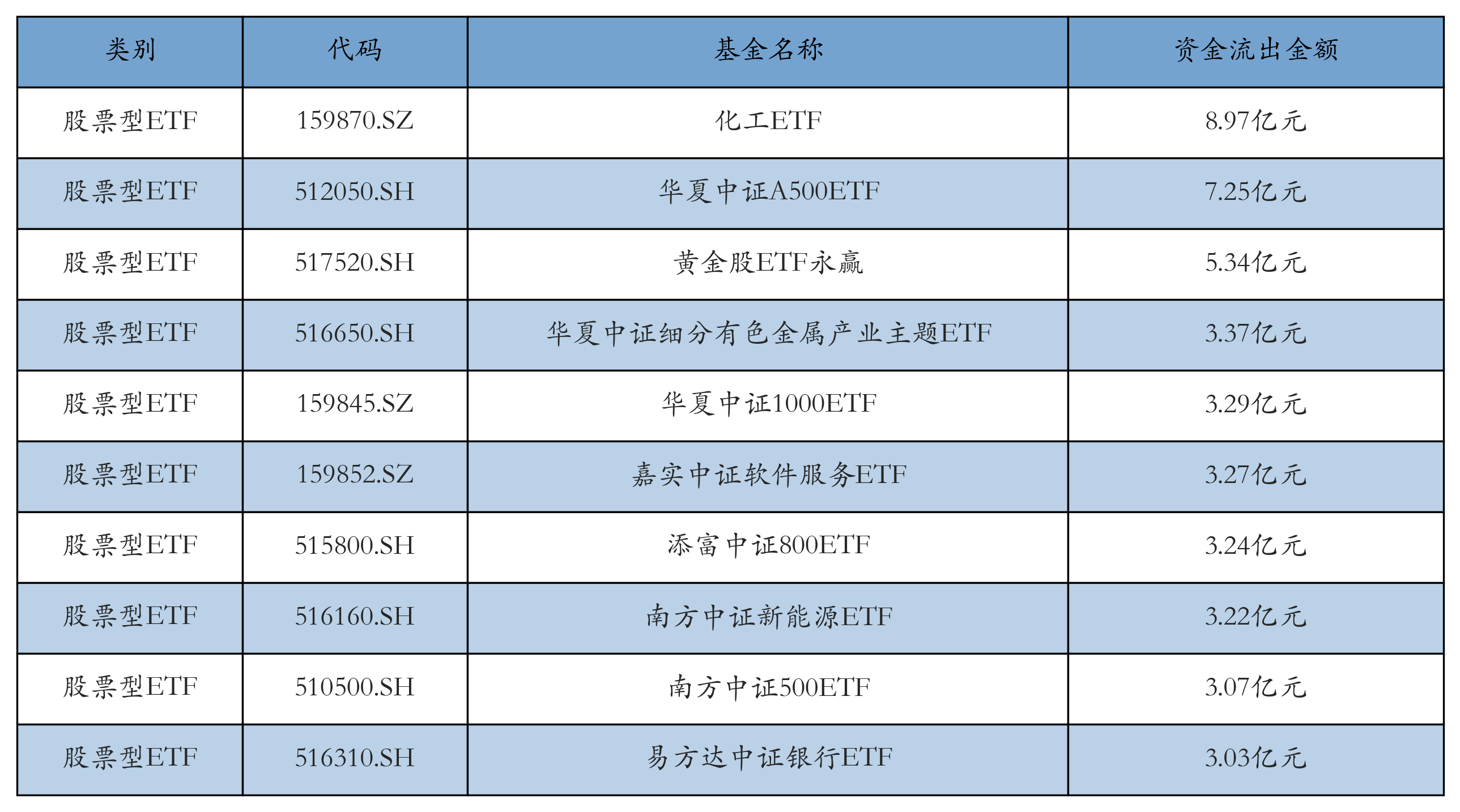 昨日股票型ETF资金流出最多的3只ETF及其流出金额分别为:化工ETF(流出8.97亿元)、华夏中证A500ETF(流出7.25亿元)、黄金股ETF永赢(流出5.34亿元)。资金流出前10详情见下表: