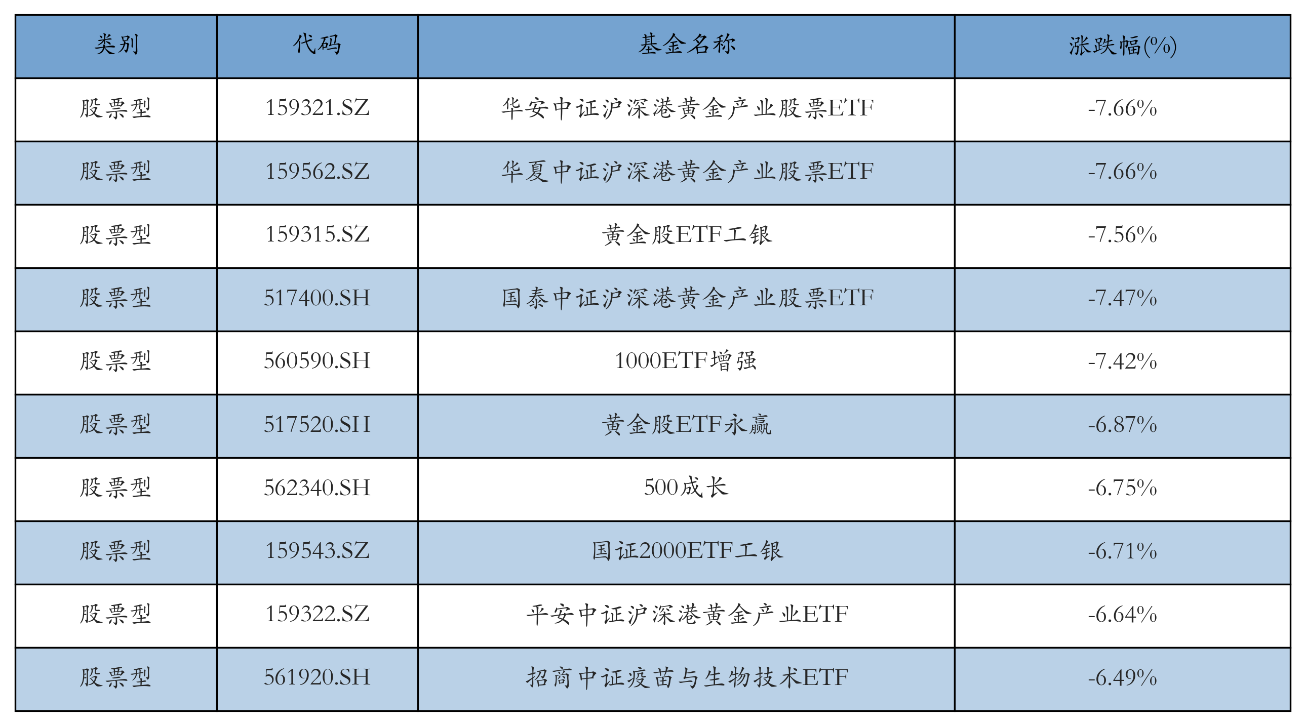 昨日股票型ETF跌幅最大的3只ETF及其收益率分别为:华安中证沪深港黄金产业股票ETF(-7.66%)、华夏中证沪深港黄金产业股票ETF(-7.66%)、黄金股ETF工银(-7.56%)。跌幅前10详情见下表:
