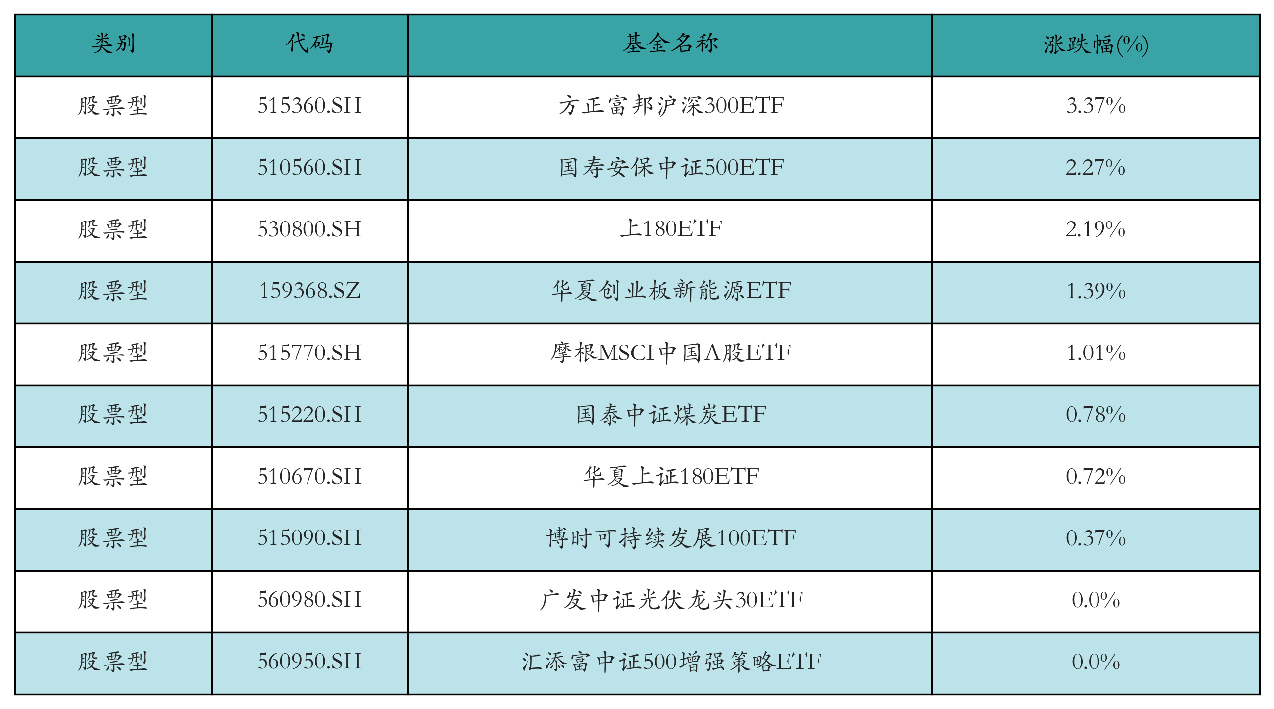 昨日股票型ETF涨幅最高的3只ETF及其收益率分别为:方正富邦沪深300ETF(3.37%)、国寿安保中证500ETF(2.27%)、上180ETF(2.19%)。涨幅前10详情见下表: