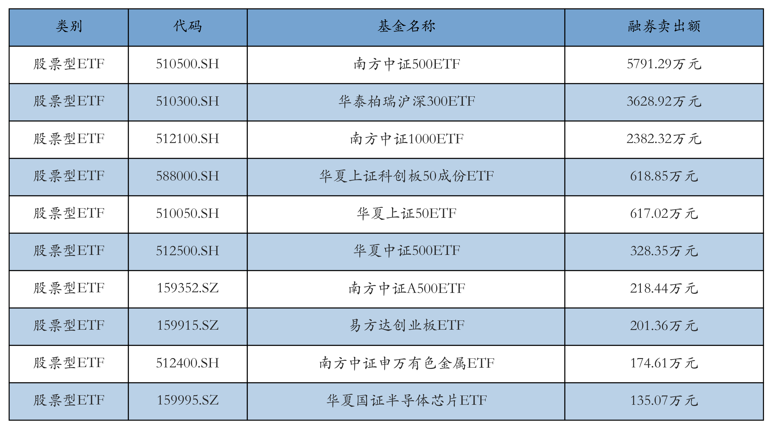 昨日股票型ETF融资卖出额最高的3只ETF及其卖出金额分别为:南方中证500ETF(5791.29万元)、华泰柏瑞沪深300ETF(3628.92万元)、南方中证1000ETF(2382.32万元)。融券卖出额前10详情见下表: