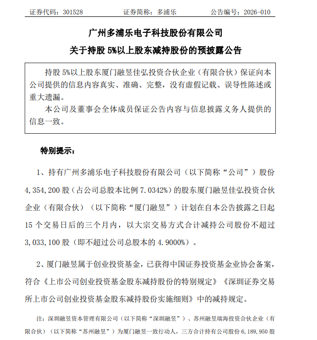 多浦乐(301528.SZ)3月23日公告称,因自身资金需求,厦门融昱佳弘投资合伙企业(有限合伙)计划于2026年4月15日至2026年7月14日减持不超303.31万股,占公司总股本不超4.9%。