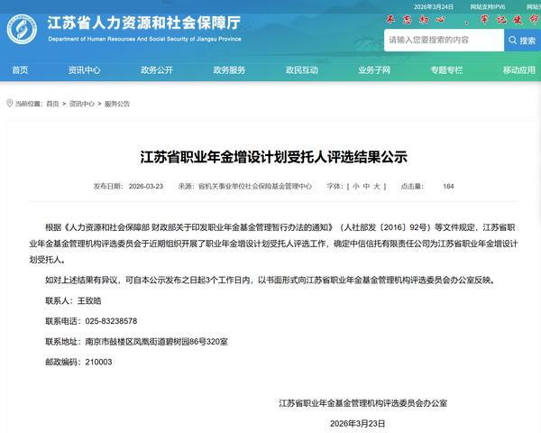 中国网财经3月24日讯昨日,江苏省人力资源和社会保障厅发布相关公告,根据《人力资源和社会保障部财政部关于印发职业年金基金管理暂行办法的通知》(人社部发〔2016〕92号)等文件规定,江苏省职业年金基金管理机构评选委员会于近期组织开展了职业年金增设计划受托人评选工作,确定中信信托有限责任公司(简称“中信信托”)为江苏省职业年金增设计划受托人。
