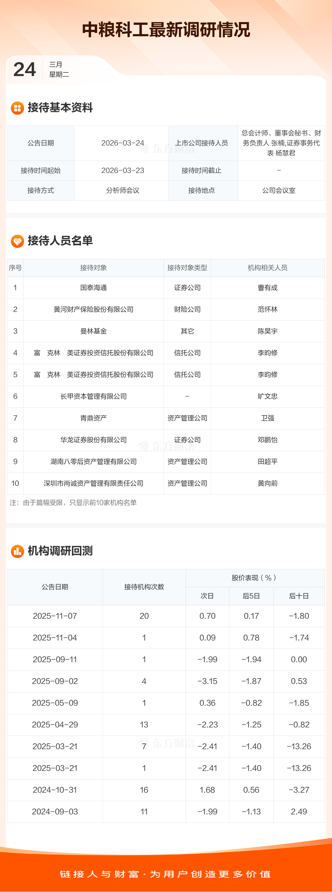 中粮科工3月24日公告称,3月23日接待国泰海通等15家机构调研。接待人员包括总会计师、董事会秘书、财务负责人 张楠,证券事务代表 杨慧君。