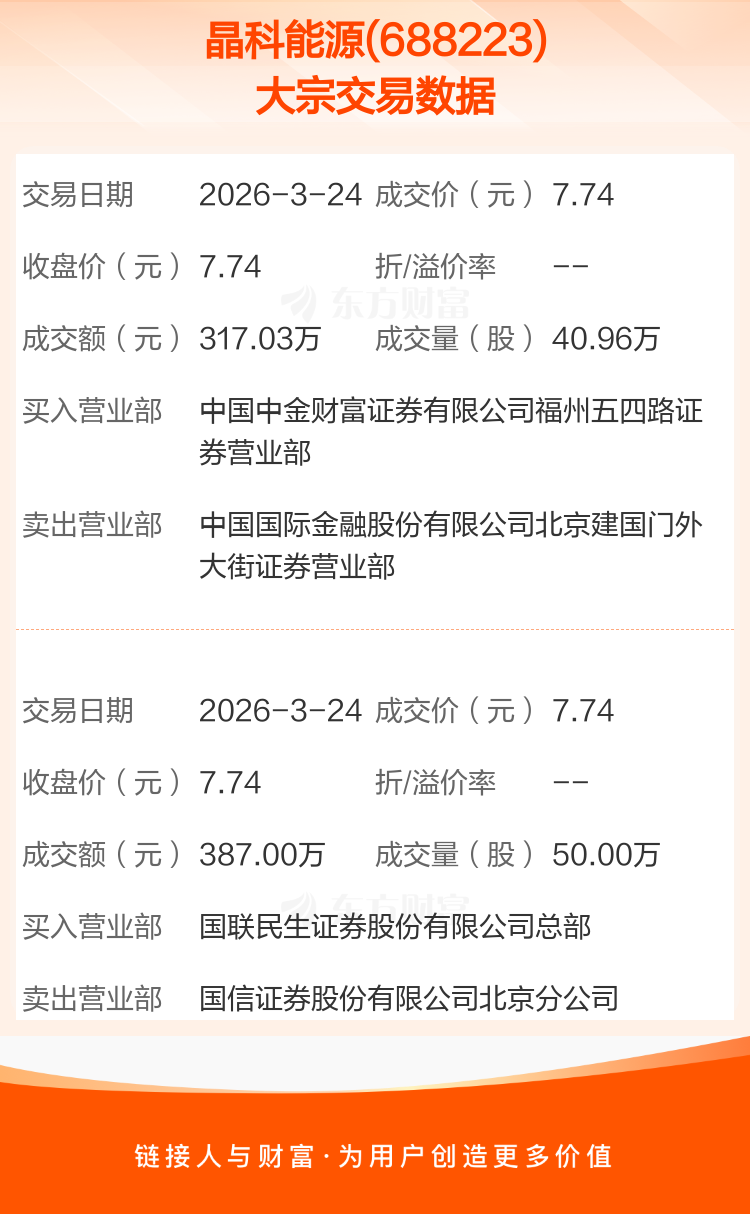 2026年3月24日,晶科能源发生2笔大宗交易,共成交90.96万股,成交金额704.03万元。