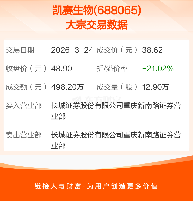 2026年3月24日,凯赛生物发生1笔大宗交易,共成交12.90万股,成交金额498.20万元,占其流通市值比例为0.02%。