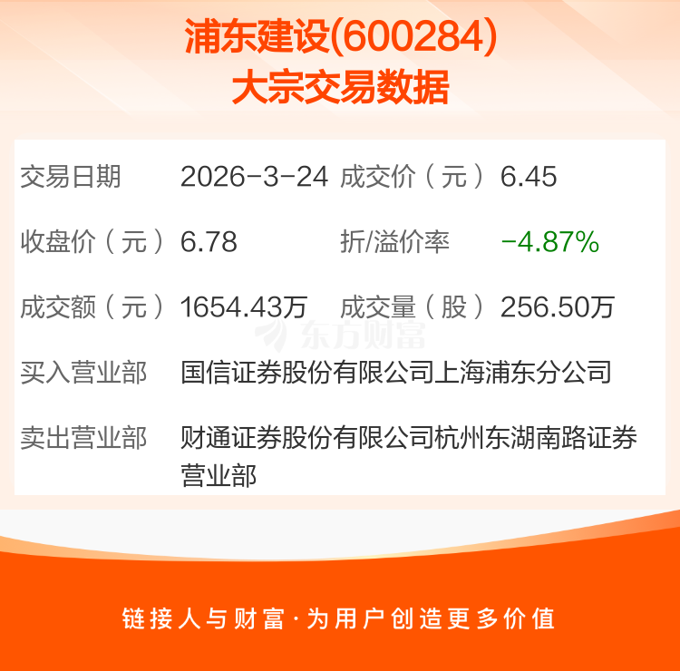 2026年3月24日,浦东建设发生1笔大宗交易,共成交256.50万股,成交金额1654.43万元,占其流通市值比例为0.25%。