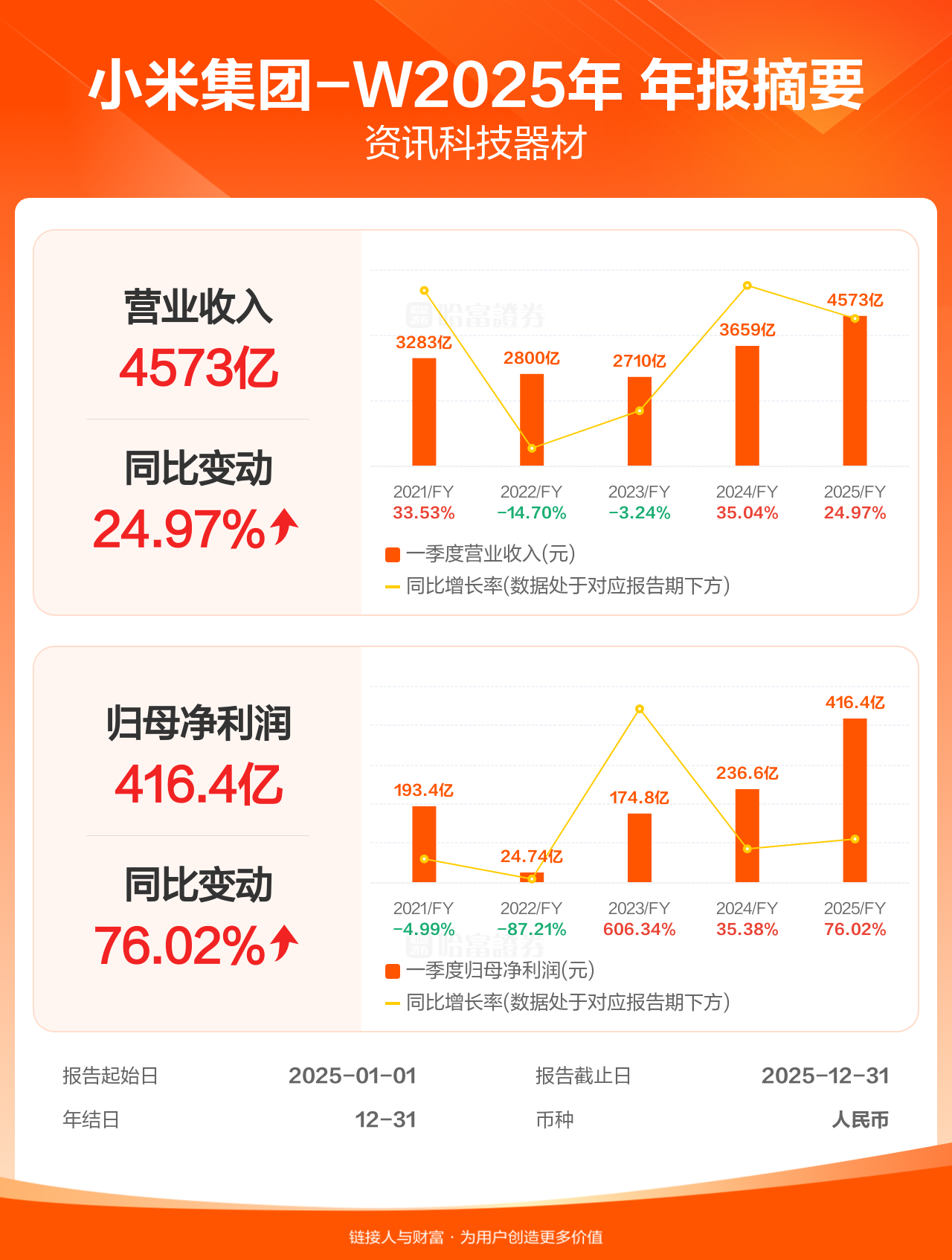 小米集团-W3月24日发布年报业绩,截至2025年12月31日的12个月内,该公司营业收入4572.87亿人民币,同比增长24.97%;公司权益持有人应占溢利(归母净利润)416.43亿人民币,同比增长76.02%,低于机构一致预测的441.89亿人民币。