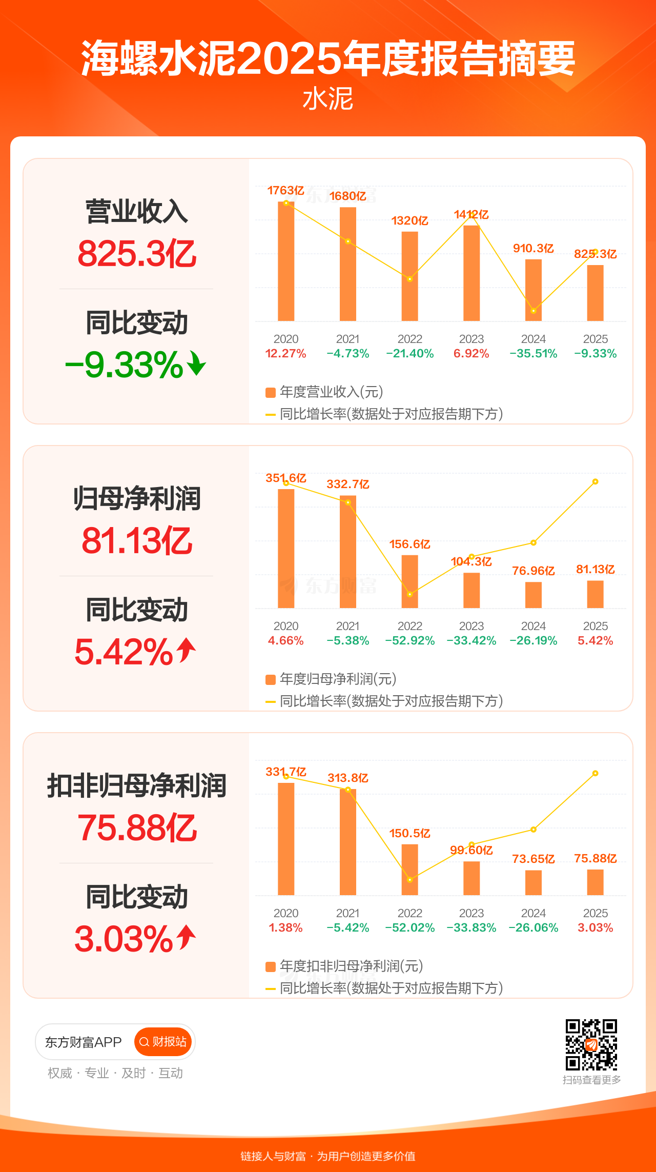 海螺水泥3月25日发布2025年年报显示,公司全年实现营业收入825.32亿元,同比下滑9.33%;归母净利润81.13亿元,同比增长5.42%;扣非归母净利润75.88亿元,同比增长3.03%。