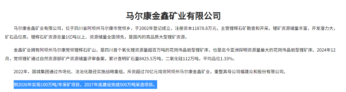 此外,采矿许可规模为100万吨/年的党坝锂矿(探矿权归属国城矿业参股公司金鑫矿业),也在推动其产能扩张。