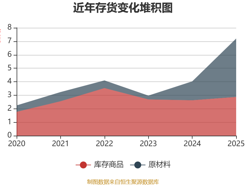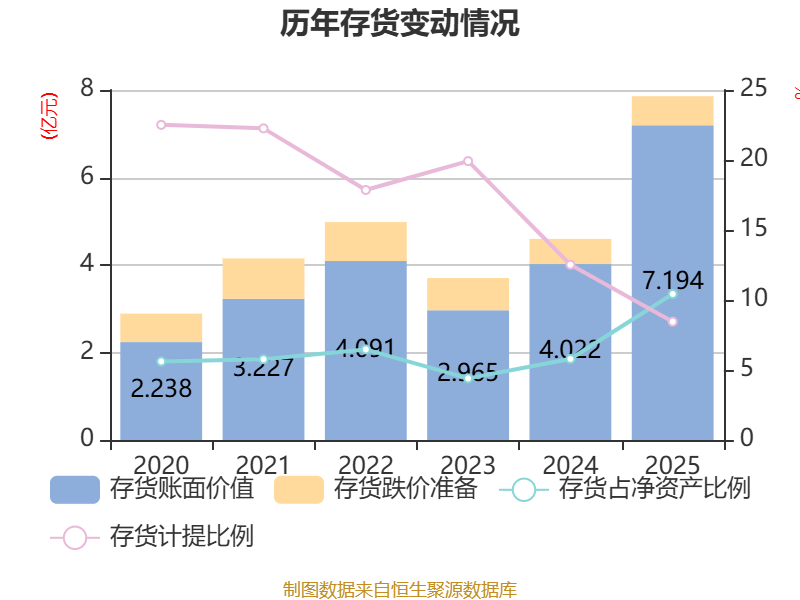 从存货变动来看,截至2025年末,公司存货账面价值为7.19亿元,占净资产的10.43%,较上年末增加3.17亿元。其中,存货跌价准备为6640.66万元,计提比例为8.45%。