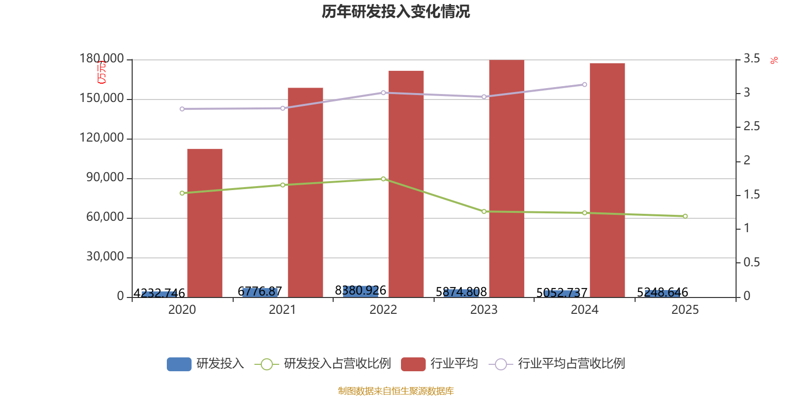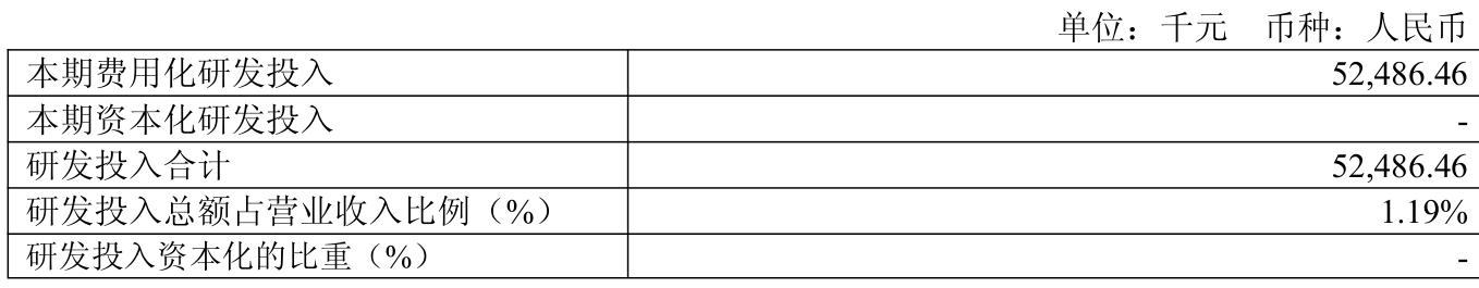 2025年全年,公司研发投入金额为5248.65万元,同比增长3.88%;研发投入占营业收入比例为1.19%,相比上年同期下降0.05个百分点。此外,公司全年研发投入资本化率为0%。