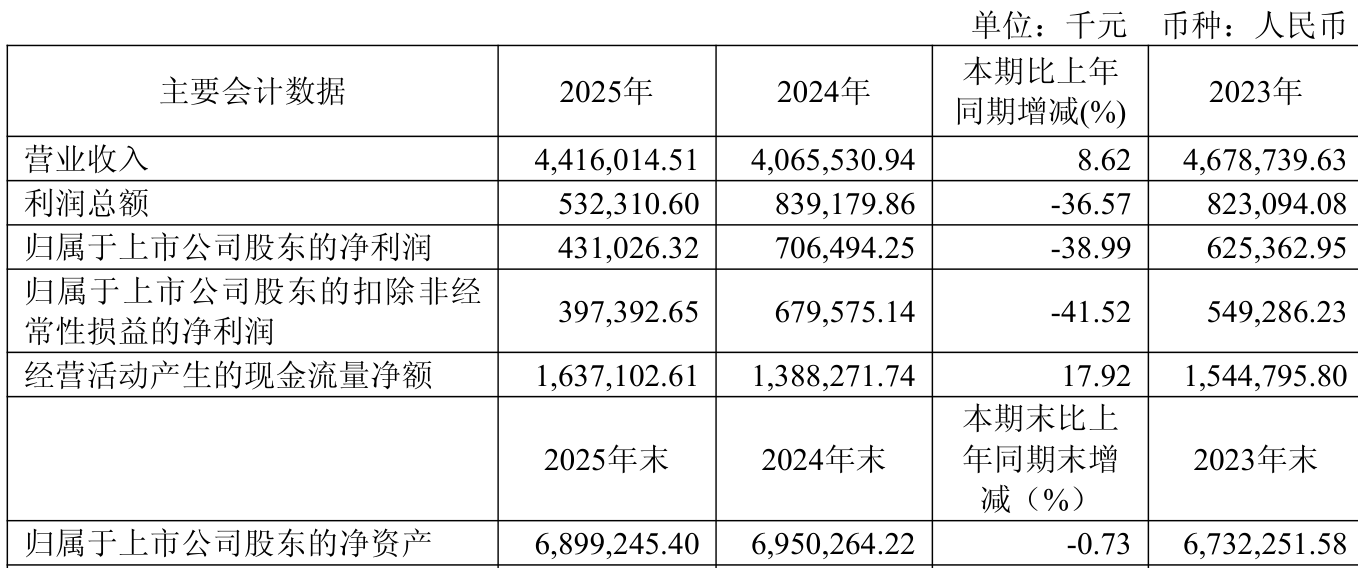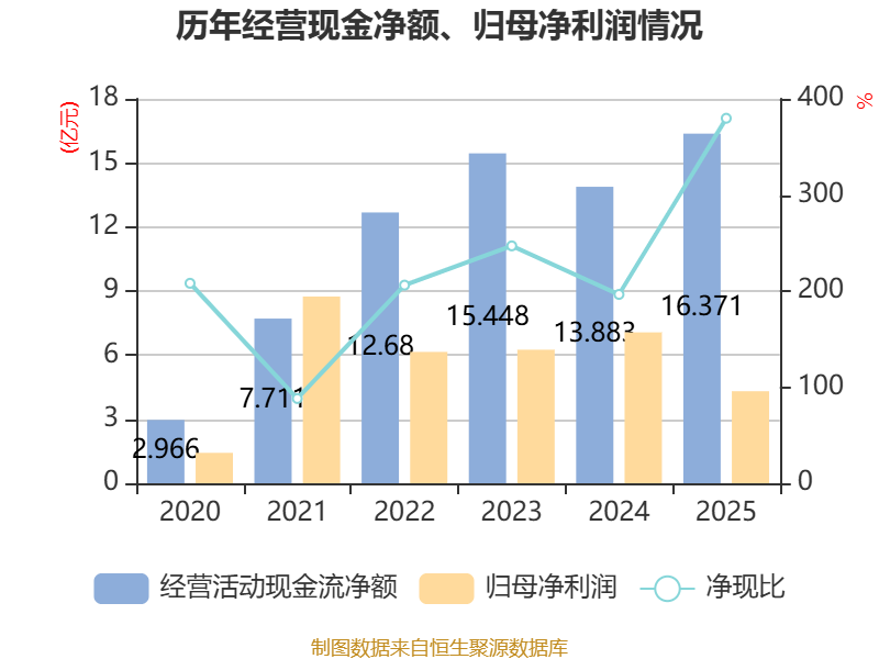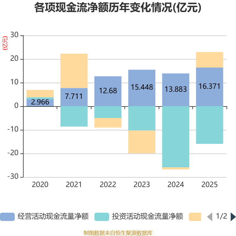 截至2025年,公司经营活动现金流净额为16.37亿元,同比增长17.92%;筹资活动现金流净额6.59亿元,同比增加7.48亿元;投资活动现金流净额-15.96亿元,上年同期为-25.91亿元。