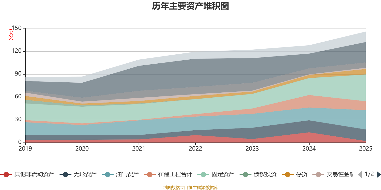 资产重大变化方面,截至2025年末,公司其他非流动资产较上年末减少85.52%,占公司总资产比重下降9.12个百分点;固定资产较上年末增加57.42%,占公司总资产比重上升6.64个百分点;在建工程合计较上年末减少27.75%,占公司总资产比重下降4.71个百分点;油气资产较上年末增加50.41%,占公司总资产比重上升4.19个百分点。