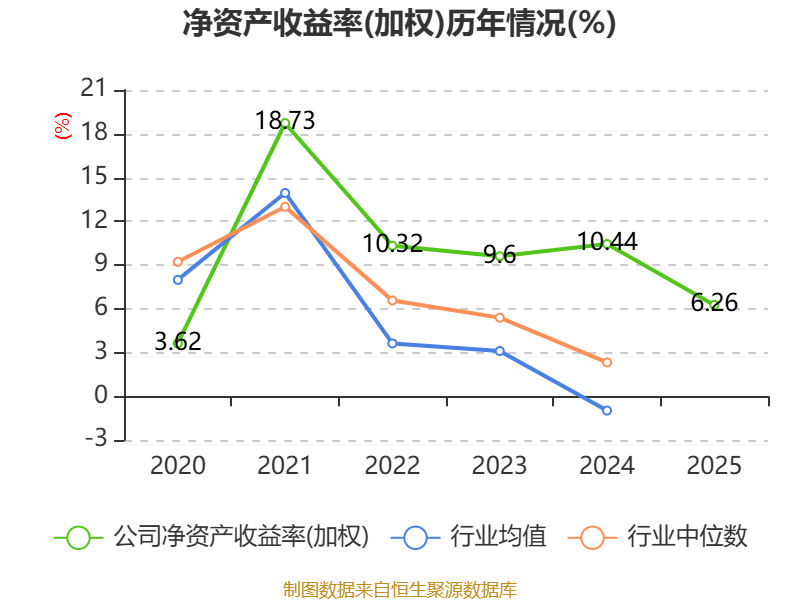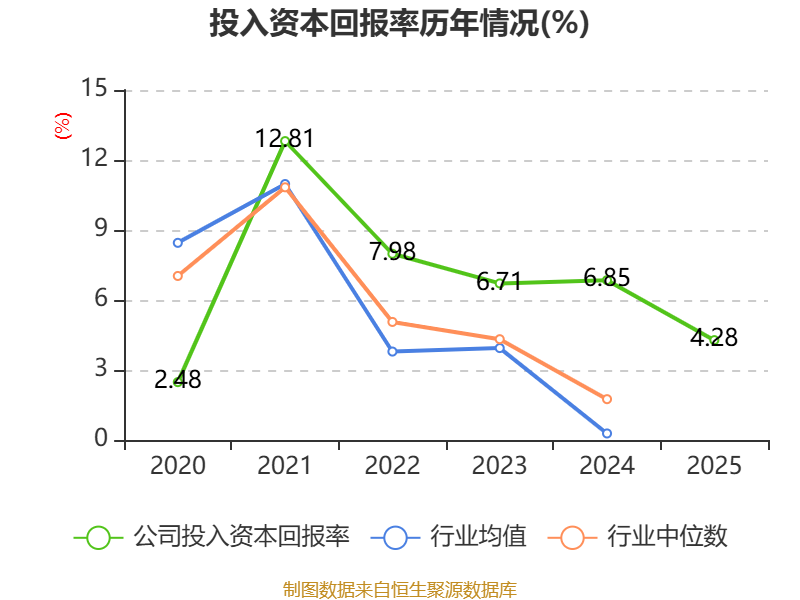 数据显示,2025年公司加权平均净资产收益率为6.26%,较上年同期下降4.18个百分点。公司2025年投入资本回报率为4.28%,较上年同期下降2.57个百分点。