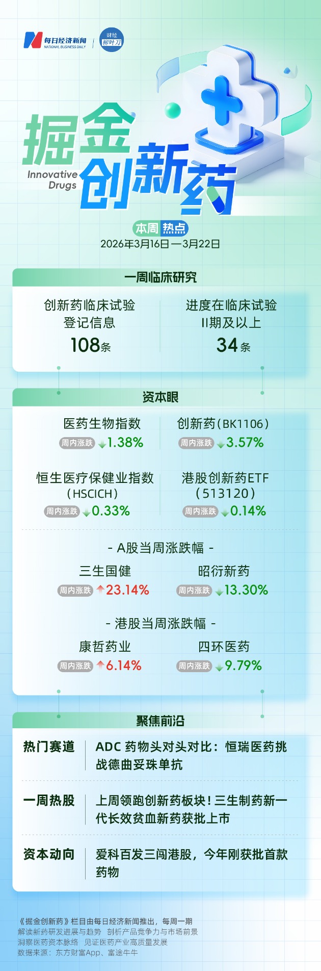 上周(3月16日至3月20日)医药生物指数下跌1.38%,跑赢上证指数2个百分点。创新药(BK1106)周内下跌3.57%;恒生医疗保健业指数(HSCICH)周内下跌0.33%;港股创新药ETF(513120)周内下跌0.14%。
