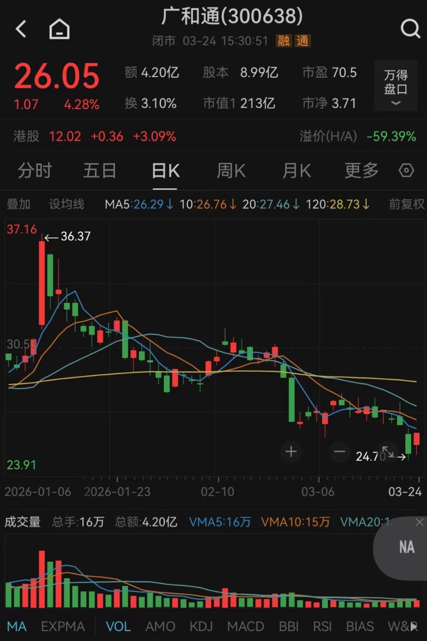 Wind数据显示,3月24日,广和通股价上涨4.28%,收盘报26.05元/股,市值为213亿元。
