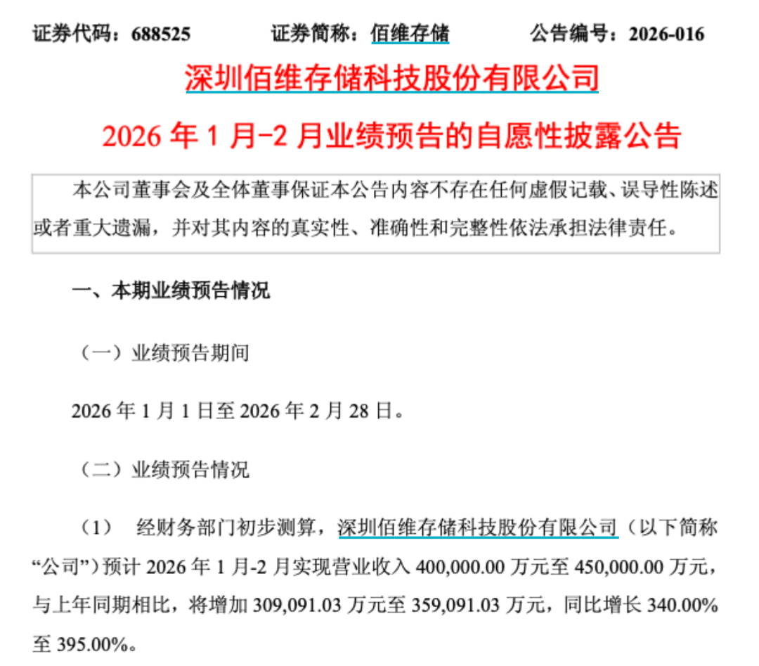 值得注意的是,今年以来,存储行业景气度持续升温,涨价潮仍在延续。近日,佰维存储罕见披露2026年1—2月业绩预告,预计前两个月实现营业收入40亿元至45亿元,同比增长340%至395%;实现归母净利润15亿元至18亿元,同比增长921.77%至1086.13%。
