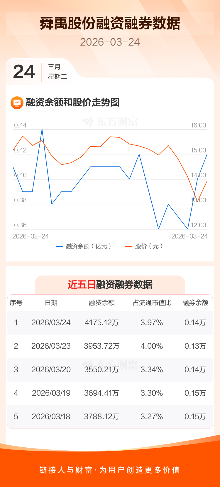 交易所最新数据显示,舜禹股份于2026年3月24日获融资买入844.11万元,融资偿还622.71万元,当日融资净买入221.4万元。目前,该股融资余额4175.12万,占流通市值比例为3.97%。