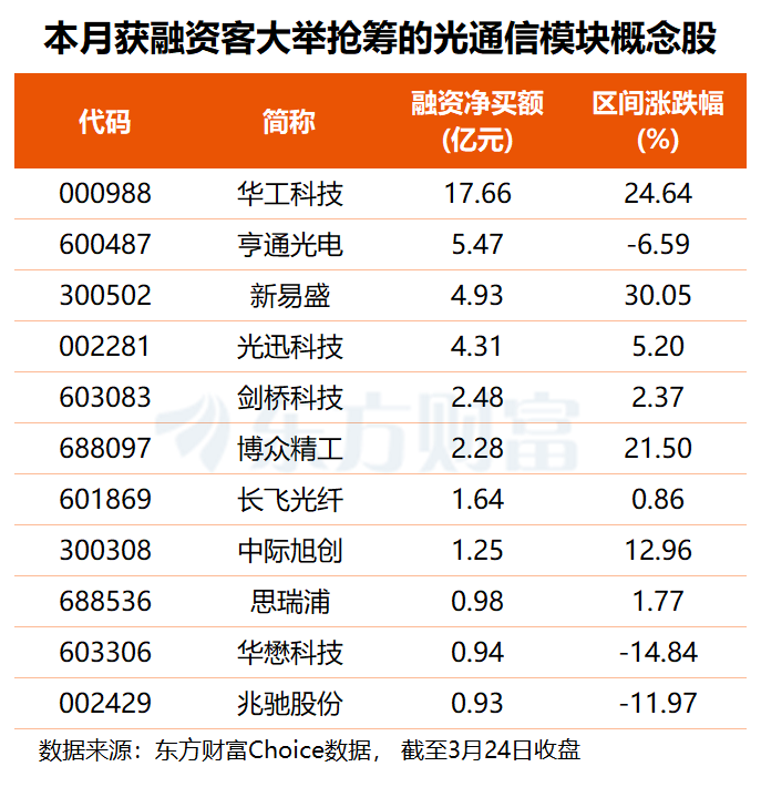 资金方面,东方财富Choice数据显示,3月以来,共有8只光通信模块概念股获得1亿元以上融资净买入,其中,华工科技获融资客大举抢筹17.66亿元,亨通光电获杠杆资金加仓5.47亿元,新易盛光迅科技融资净买额均超4亿元。