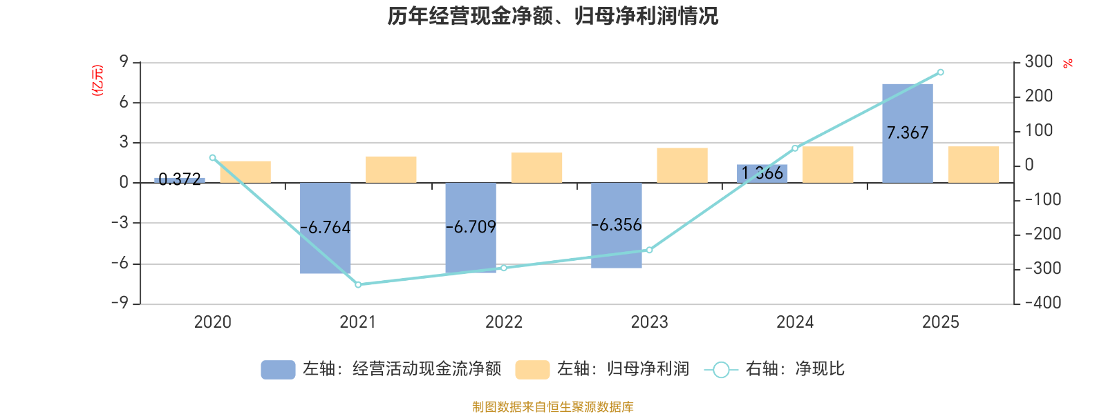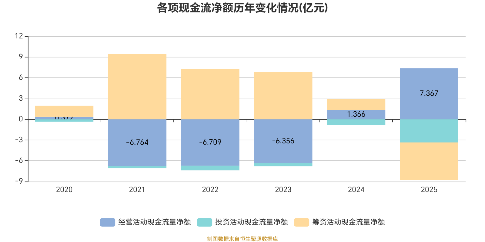 2025年,公司经营活动现金流净额为7.37亿元,同比增长439.35%;筹资活动现金流净额-5.43亿元,同比减少7亿元;投资活动现金流净额-3.35亿元,上年同期为-8659.2万元。