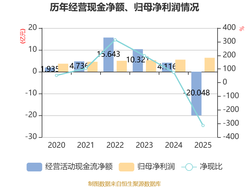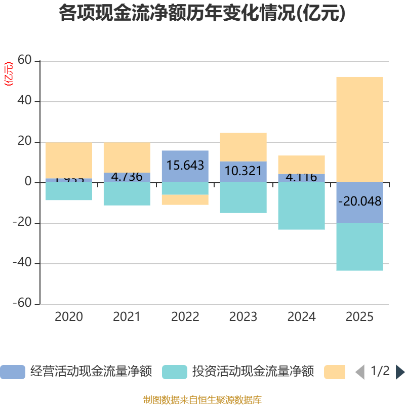 截至2025年,公司经营活动现金流净额为-20.05亿元,同比减少24.16亿元;筹资活动现金流净额52.01亿元,同比增加42.92亿元;投资活动现金流净额-23.6亿元,上年同期为-23.39亿元。