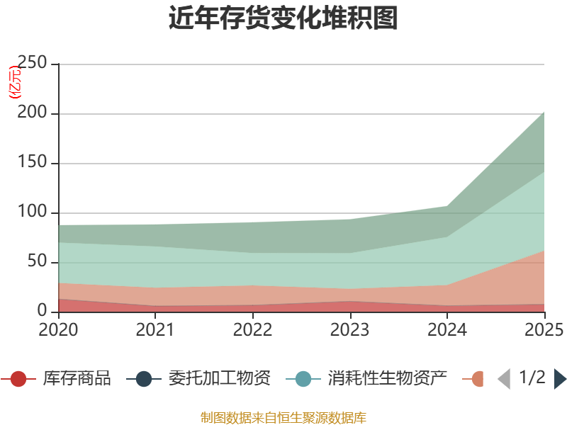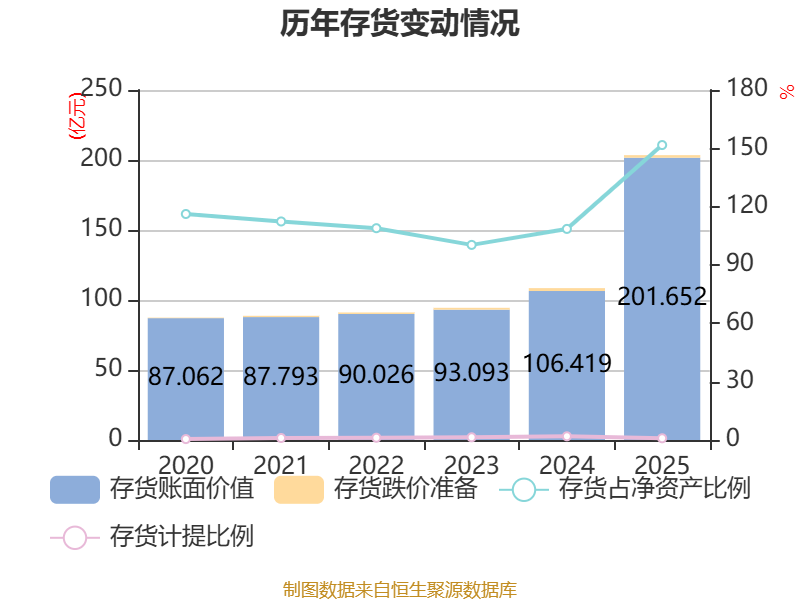 从存货变动来看,截至2025年末,公司存货账面价值为201.65亿元,占净资产的151.69%,较上年末增加95.23亿元。其中,存货跌价准备为1.82亿元,计提比例为0.89%。