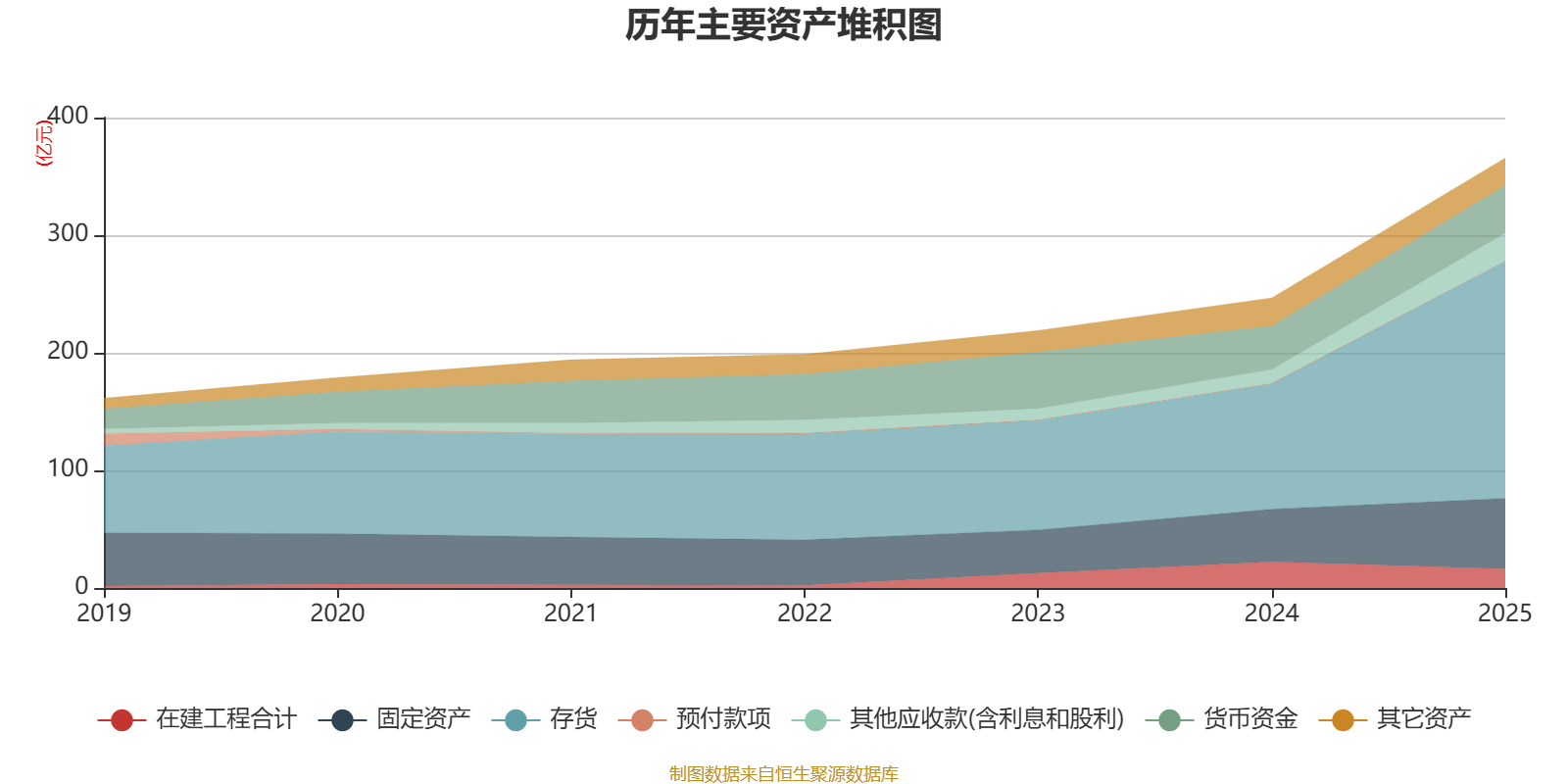 资产重大变化方面,截至2025年末,公司存货较上年末增加89.49%,占公司总资产比重上升12.03个百分点;在建工程合计较上年末减少27.35%,占公司总资产比重下降4.61个百分点;货币资金较上年末增加8.63%,占公司总资产比重下降4.03个百分点;其他应收款(含利息和股利)较上年末增加103.32%,占公司总资产比重上升1.76个百分点。