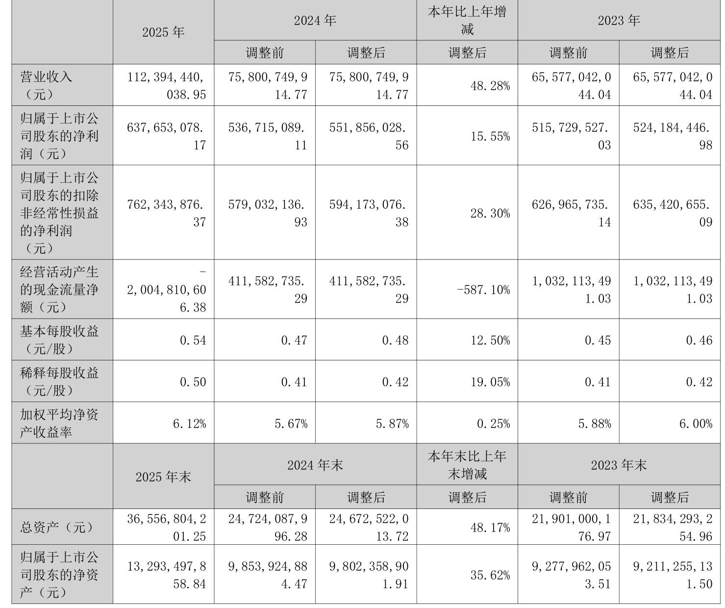 中证智能财讯恒邦股份(002237)3月25日披露2025年年度报告。2025年,公司实现营业总收入1123.94亿元,同比增长48.28%;归母净利润6.38亿元,同比增长15.55%;扣非净利润7.62亿元,同比增长28.30%;经营活动产生的现金流量净额为-20.05亿元,上年同期为4.12亿元;报告期内,恒邦股份基本每股收益为0.54元,加权平均净资产收益率为6.12%。公司2025年度分配预案为:拟向全体股东每10股派现1.34元(含税)。