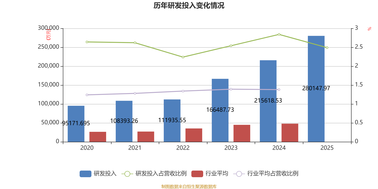 2025年全年,公司研发投入金额为28.01亿元,同比增长29.93%;研发投入占营业收入比例为2.49%,相比上年同期下降0.35个百分点。此外,公司全年研发投入资本化率为0%。