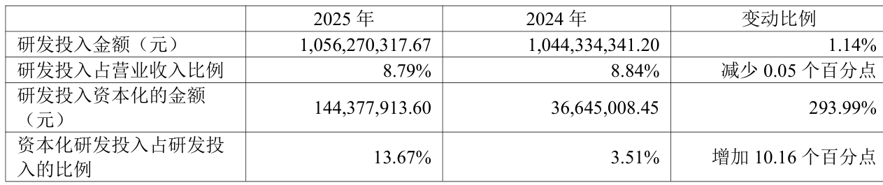 2025年全年,公司研发投入金额为10.56亿元,同比增长1.14%;研发投入占营业收入比例为8.79%,相比上年同期下降0.05个百分点。此外,公司全年研发投入资本化率为13.67%。