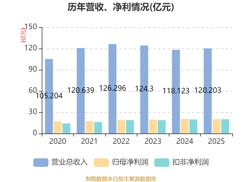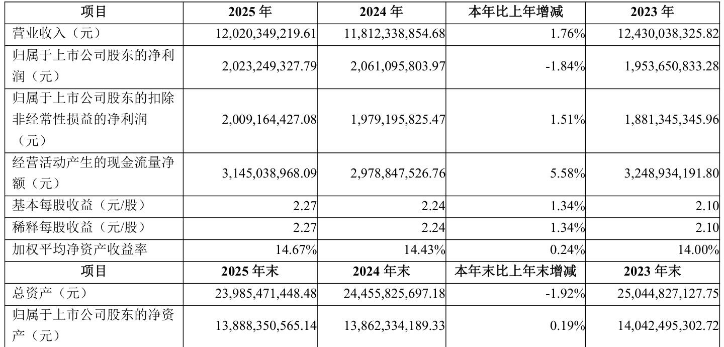 中证智能财讯丽珠集团(000513)3月25日披露2025年年度报告。2025年,公司实现营业总收入120.2亿元,同比增长1.76%;归母净利润20.23亿元,同比下降1.84%;扣非净利润20.09亿元,同比增长1.51%;经营活动产生的现金流量净额为31.45亿元,同比增长5.58%;报告期内,丽珠集团基本每股收益为2.27元,加权平均净资产收益率为14.67%。公司2025年度分配预案为:拟向全体股东每10股派现14.3元(含税)。